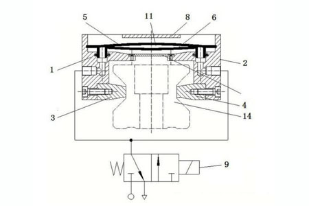 1、右座體 2、左鎖緊片 3、右鎖緊片 4、上彈簧鋼片 5、下彈簧鋼片 6、彈簧片 7、限位凸臺 8 和電磁閥 9,左座體和右座體相對鏡像設(shè)置,左座體和右座體上方中心設(shè)有限位凸臺 8,左座體 1 和右座體 2 經(jīng)彈簧片 7 固定連接,左座體 1 和右座體 2 上端中心設(shè)有彈簧鋼片腔 12,下端中心設(shè)有線軌滑塊移動腔 13,下端一側(cè)與左鎖緊片 3固定連接,另一側(cè)與右鎖緊片 4固定連接,左座體 1 和右座體 2 外側(cè)壁上分別設(shè)有氣體通道 10,限位凸臺分別與左座體和右座體固定連接,左鎖緊片 3 和右鎖緊片 4 相對設(shè)置,以利于對線軌滑塊進(jìn)行夾緊制動,彈簧鋼片腔內(nèi)設(shè)有由上彈簧鋼片 5 和下彈簧鋼片 6 周邊密封連接而形成彈簧伸縮囊 11,彈簧伸縮囊 11 一端與左座體 1 固定連接,另一端與右座體 2 固定連接,上端與限位凸臺 8 相抵觸,下端與彈簧片 7 相抵觸,彈簧伸縮囊 11 上設(shè)有壓縮空氣出入口,氣體通道 10 一端與壓縮空氣出入口相連通,另一端與氣源相連通,以使彈簧伸縮囊 11內(nèi)填充有壓力氣體,氣體通道 10上設(shè)有電磁閥 9,以利于通過電磁閥 9自動控制彈簧伸縮囊 11 內(nèi)的氣體含量,使彈簧伸縮囊 11 帶動左座體 1 和右座體 2 相對移動或相背移動,進(jìn)而實(shí)現(xiàn)自動調(diào)整左鎖緊片 3 和右鎖緊片 4 對線軌滑塊進(jìn)行自動夾緊制動的作用。