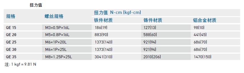 導(dǎo)軌裝配螺絲之扭力值安裝導(dǎo)軌時是否鎖緊貼平基準(zhǔn)面影響直線導(dǎo)軌精度甚劇,因此為達到每顆螺絲都能鎖緊的目的,建議使用下列扭力值鎖裝配螺絲。